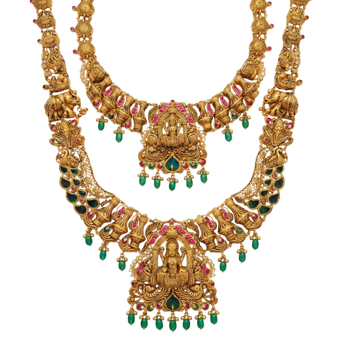 A timeless antique gold set crafted with intricate temple-style detailing and rich heritage motifs.