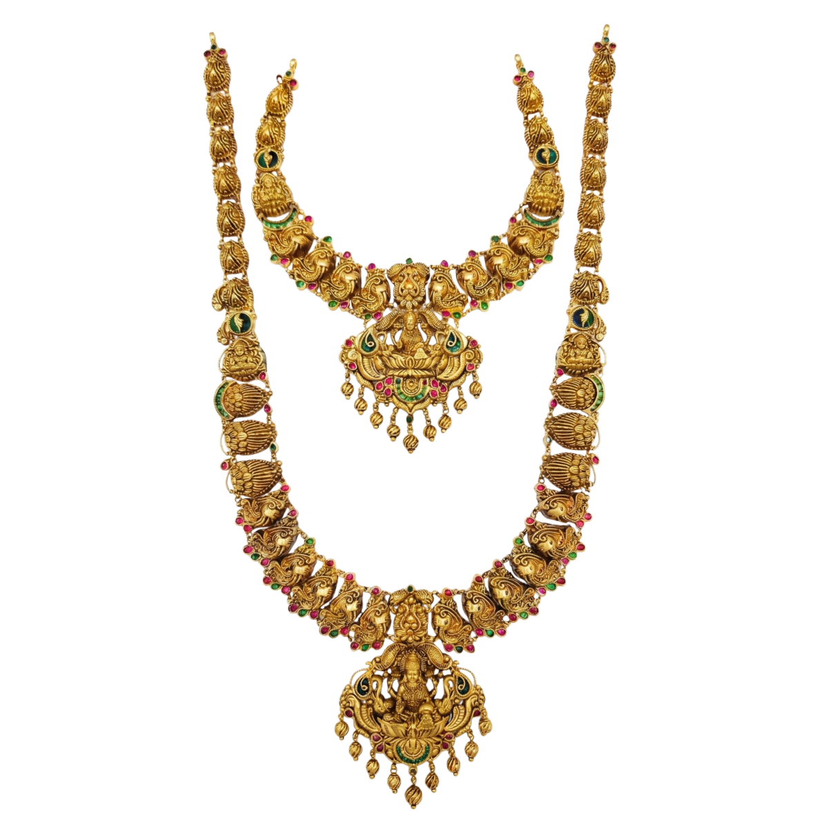 A timeless antique gold set crafted with intricate temple-style detailing and rich heritage motifs.