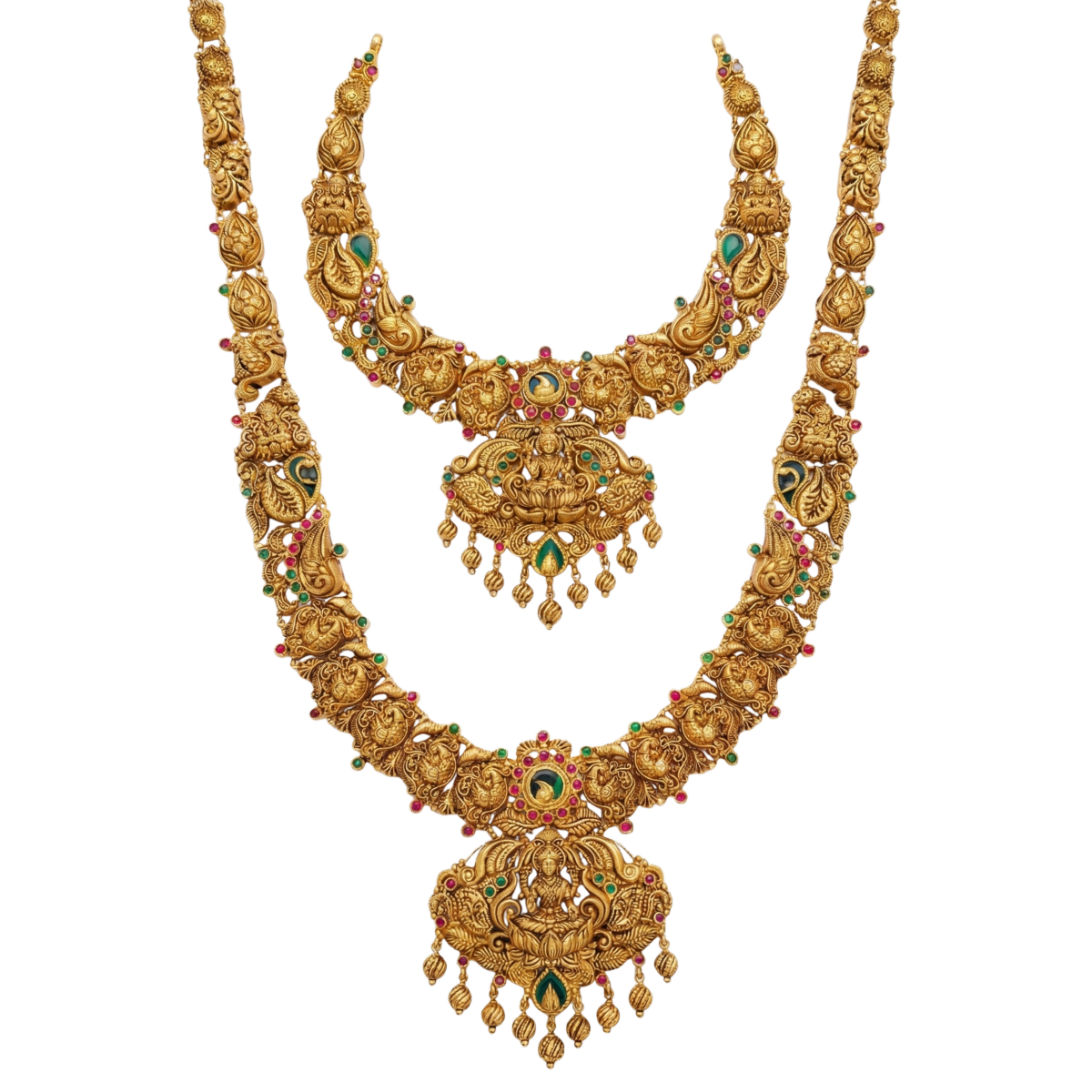 A timeless antique gold set crafted with intricate temple-style detailing and rich heritage motifs.