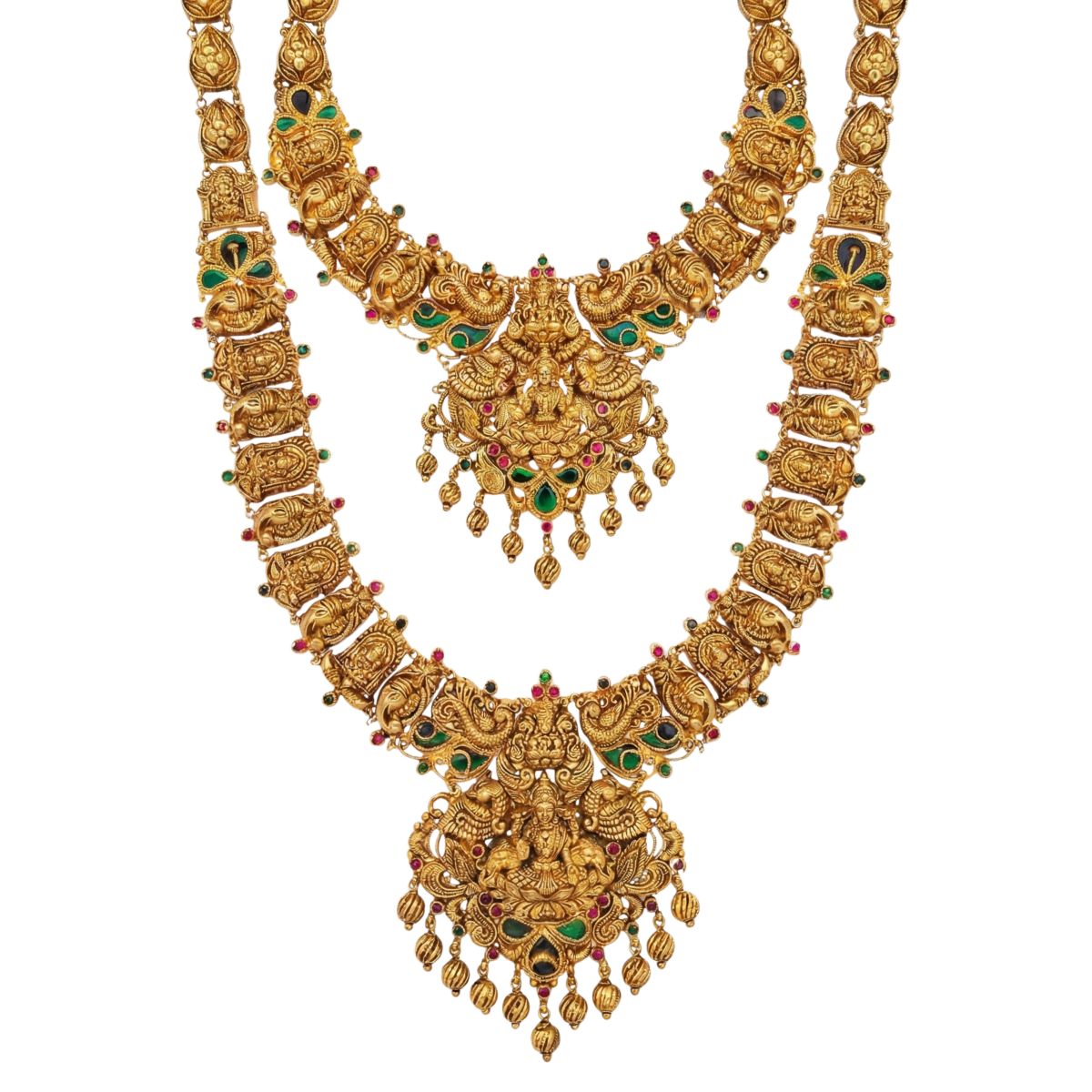 A timeless antique gold set crafted with intricate temple-style detailing and rich heritage motifs.