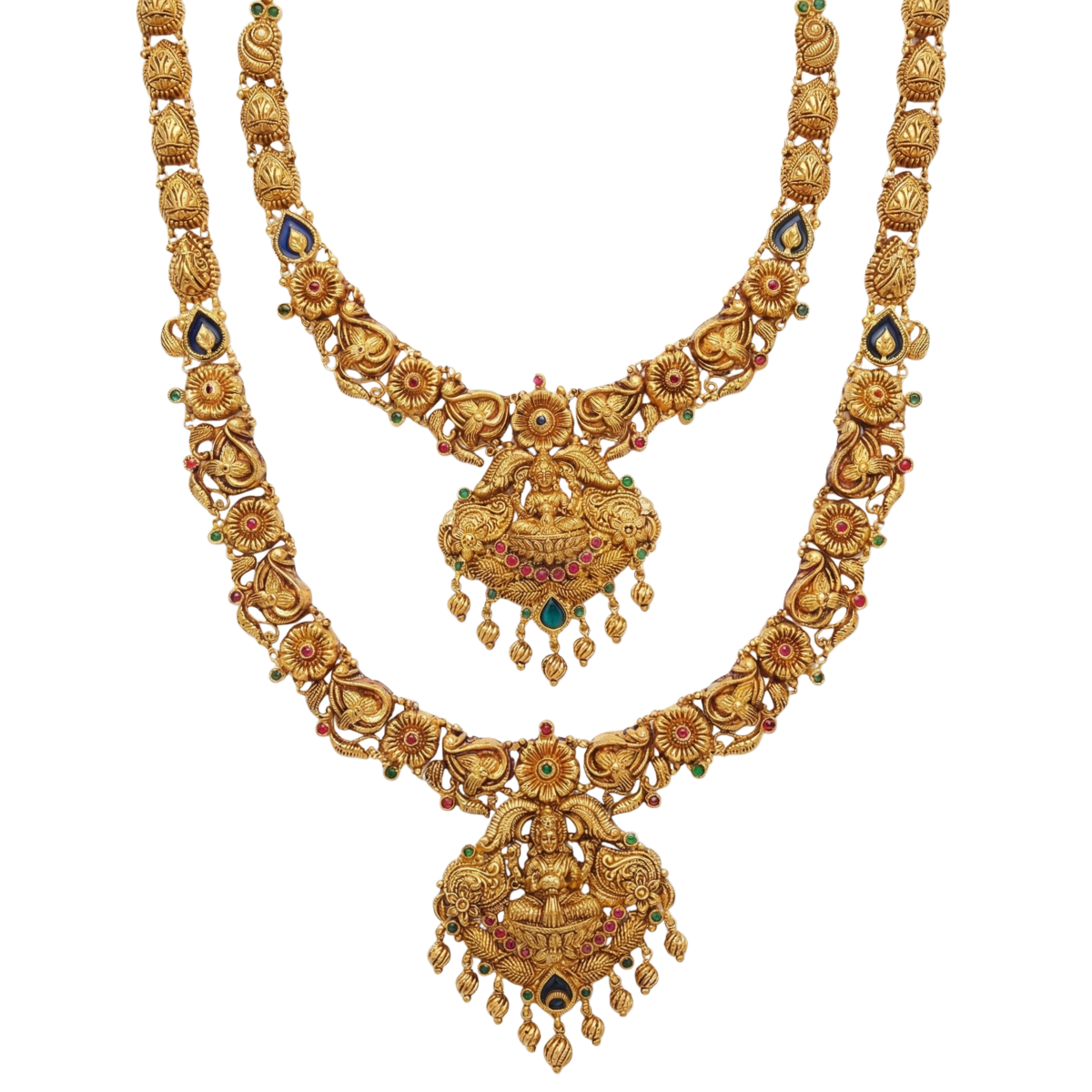 A timeless antique gold set crafted with intricate temple-style detailing and rich heritage motifs.