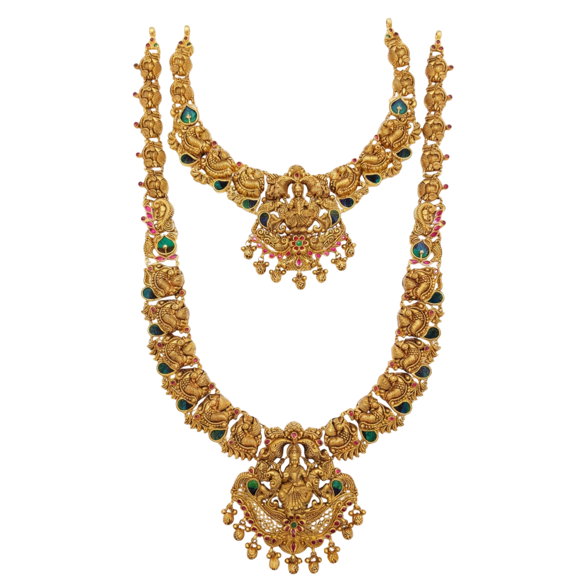 A timeless antique gold set crafted with intricate temple-style detailing and rich heritage motifs.