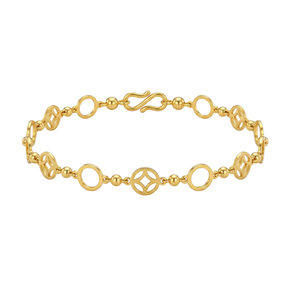 A beautifully crafted gold bracelet featuring delicate openwork floral motifs and a refined chain finish.