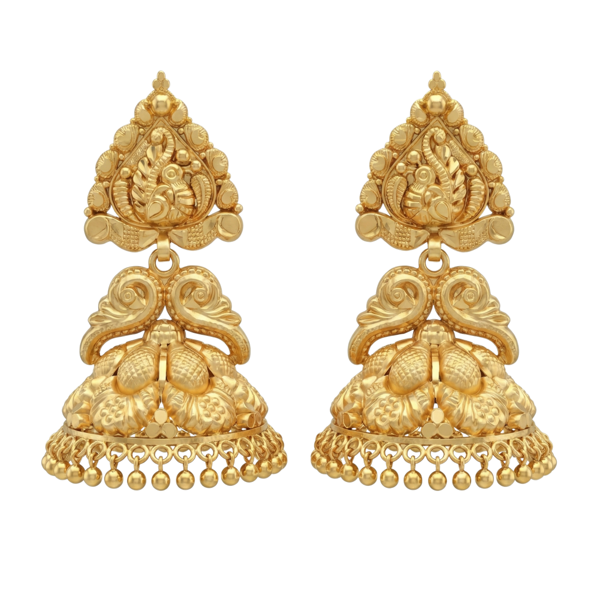 Gracefully crafted antique gold jhumkas featuring intricate temple-inspired motifs and a classic dome silhouette.