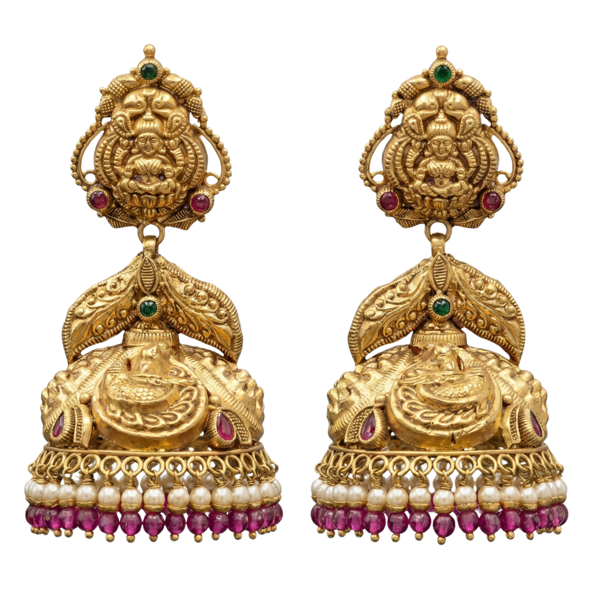 Gracefully crafted antique gold jhumkas featuring intricate temple-inspired motifs and a classic dome silhouette.