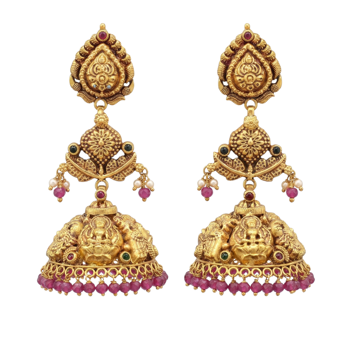 Gracefully crafted antique gold jhumkas featuring intricate temple-inspired motifs and a classic dome silhouette.